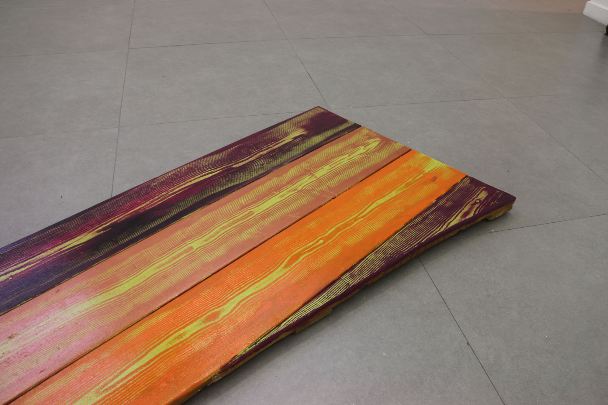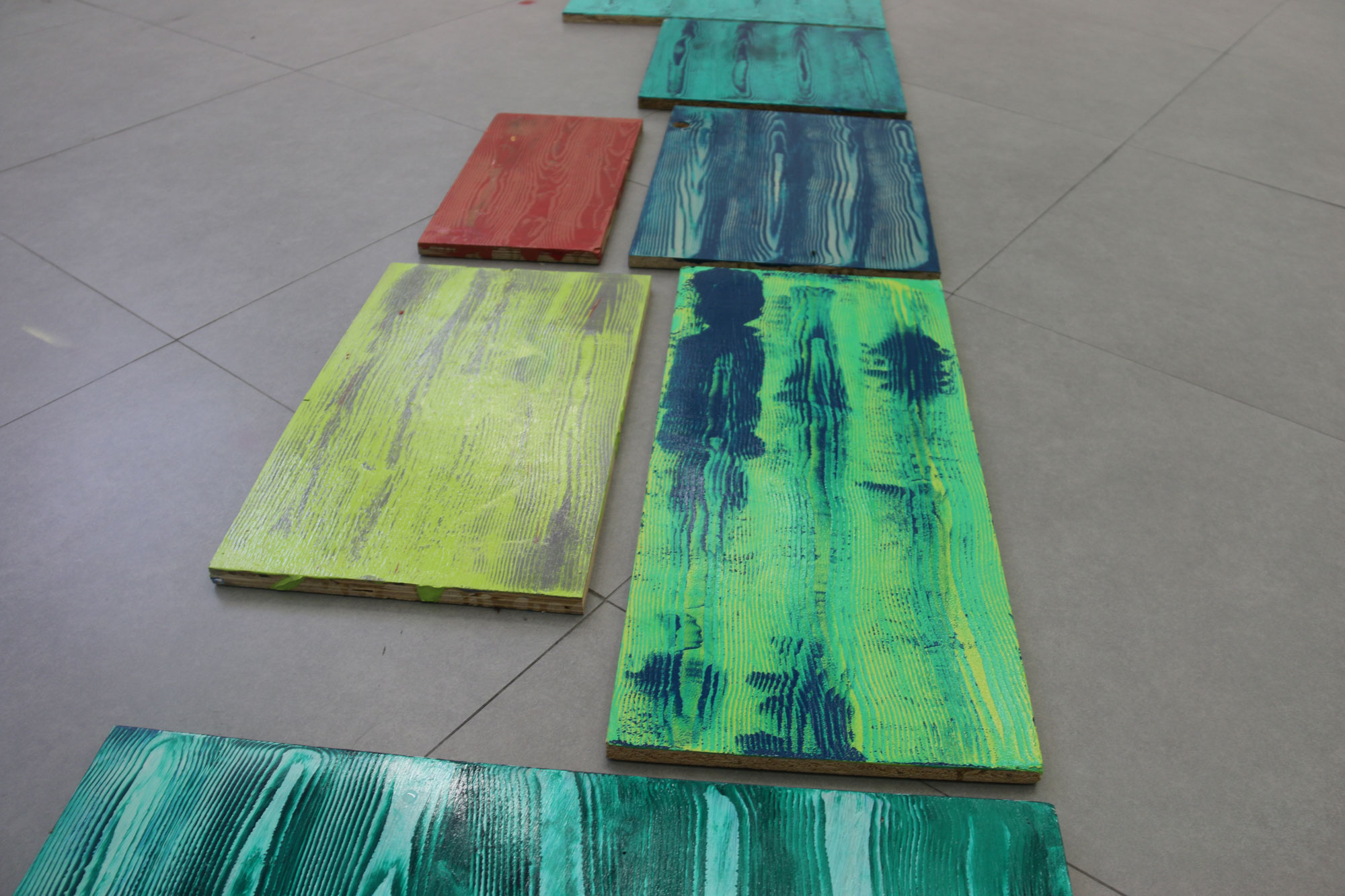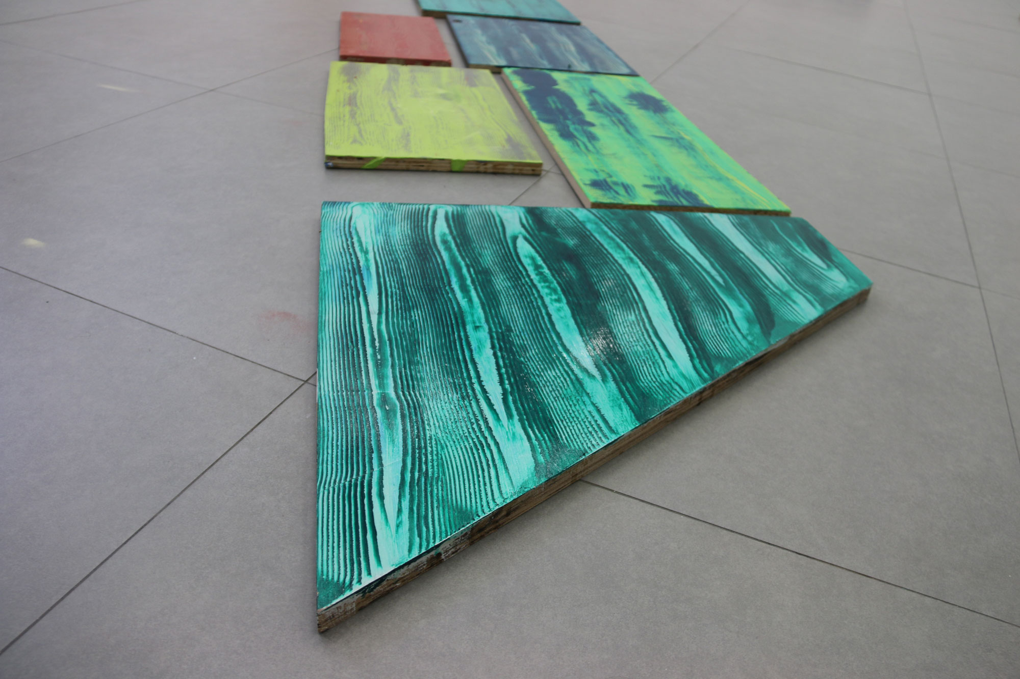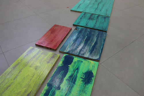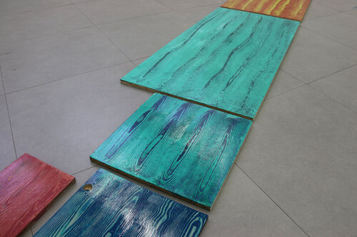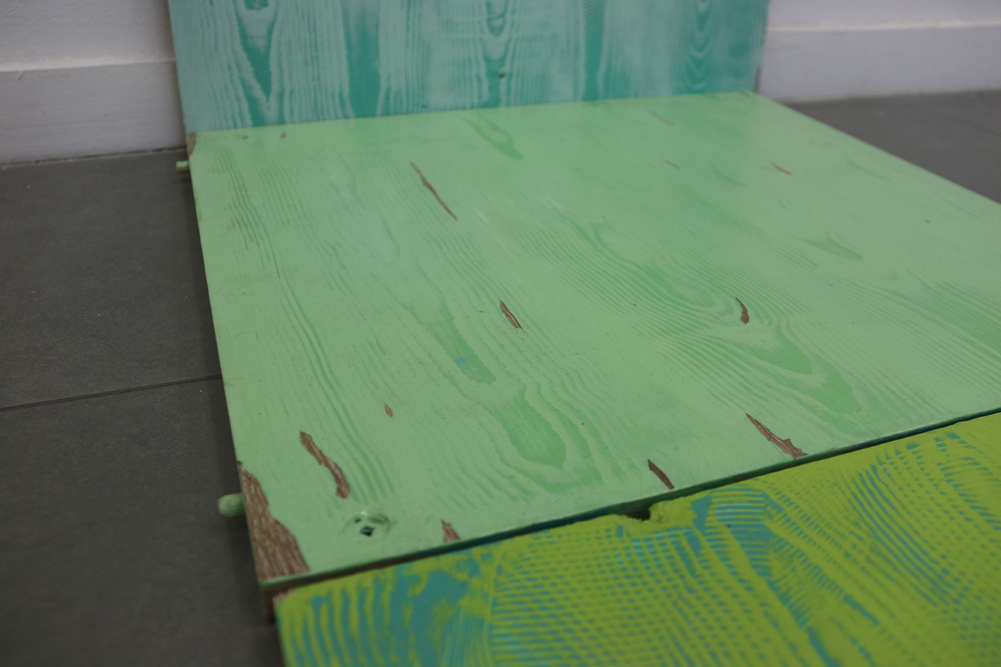 Chaque motif bois est recherché artificiellement, les planche traitées sont du bois transformé, les veines du bois n’étant plus, je cherche à les retrouver par la peinture. Protocole mis en place suite à des observations de nature, dans l’espace urbain. Nature toujours contrôlée.