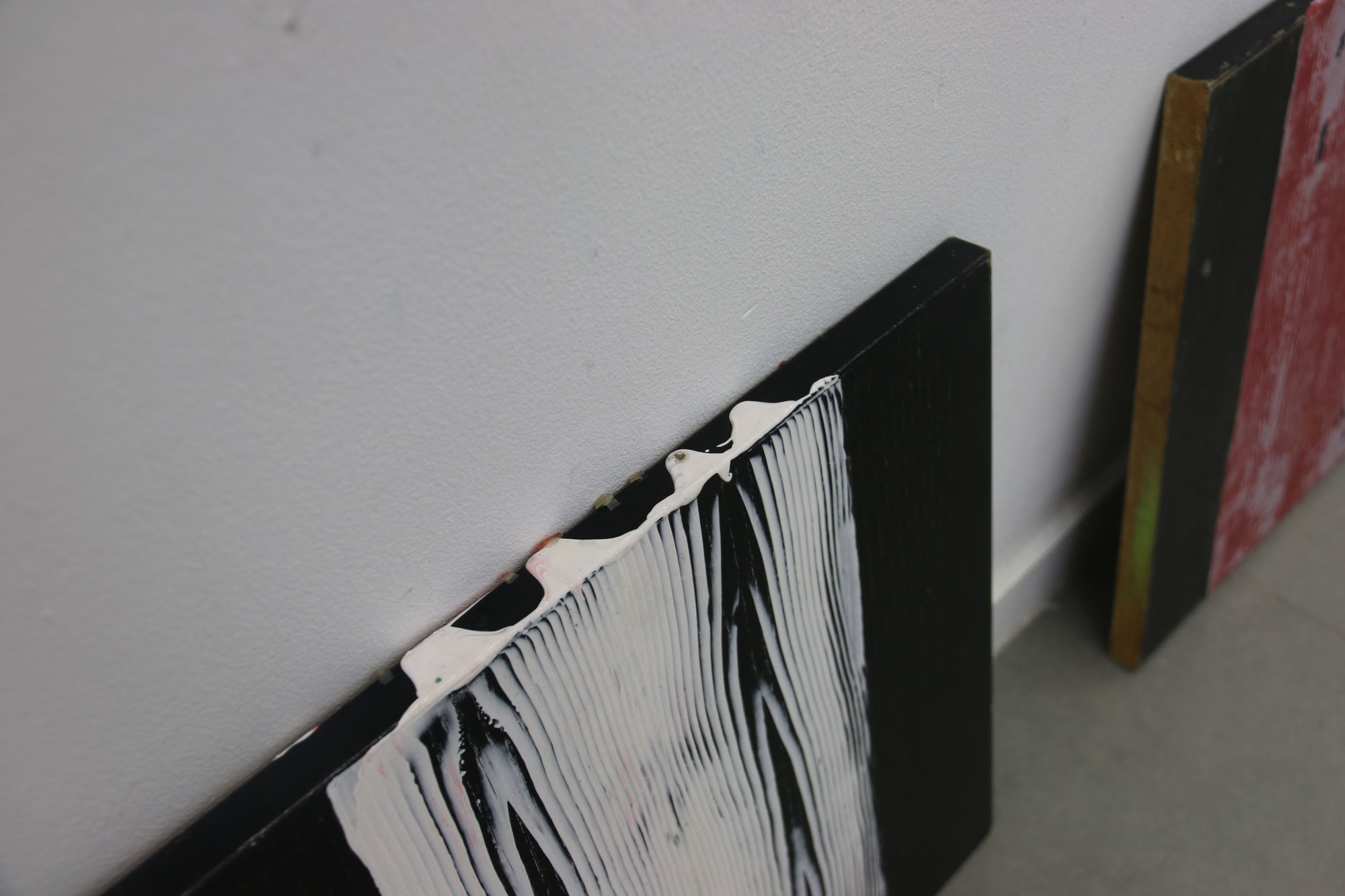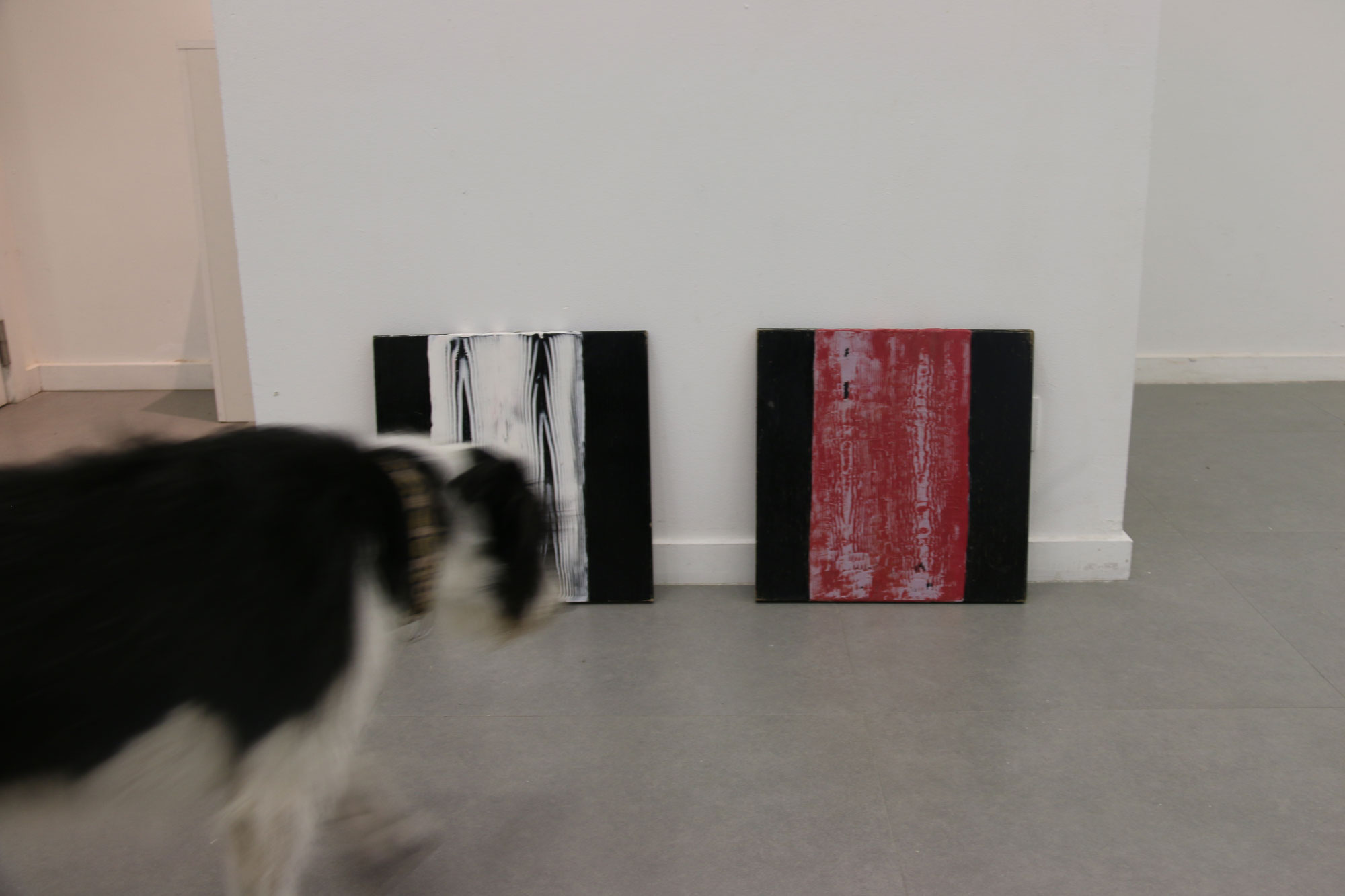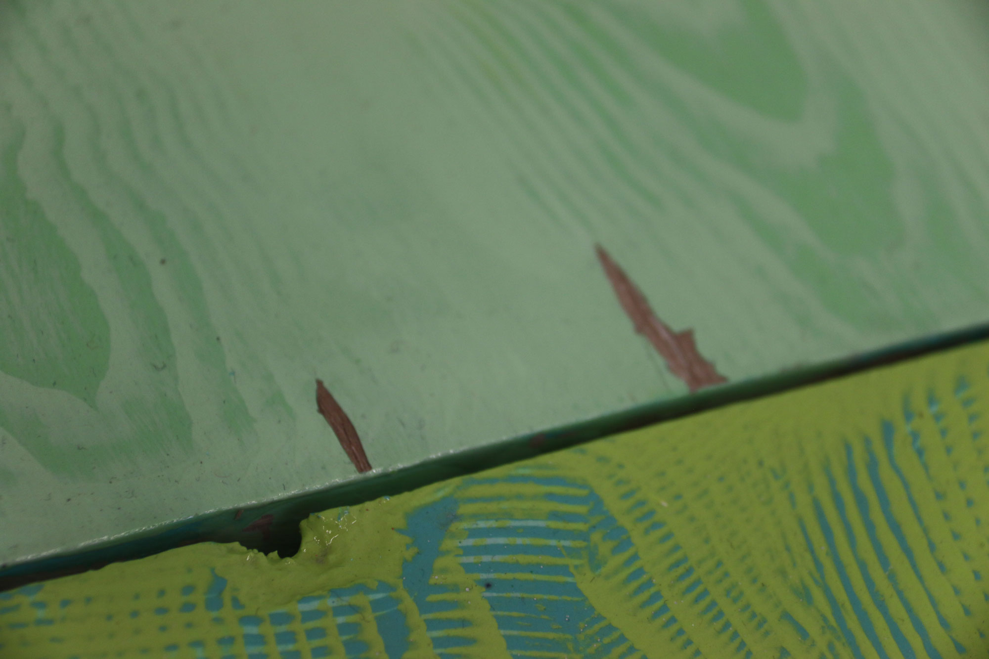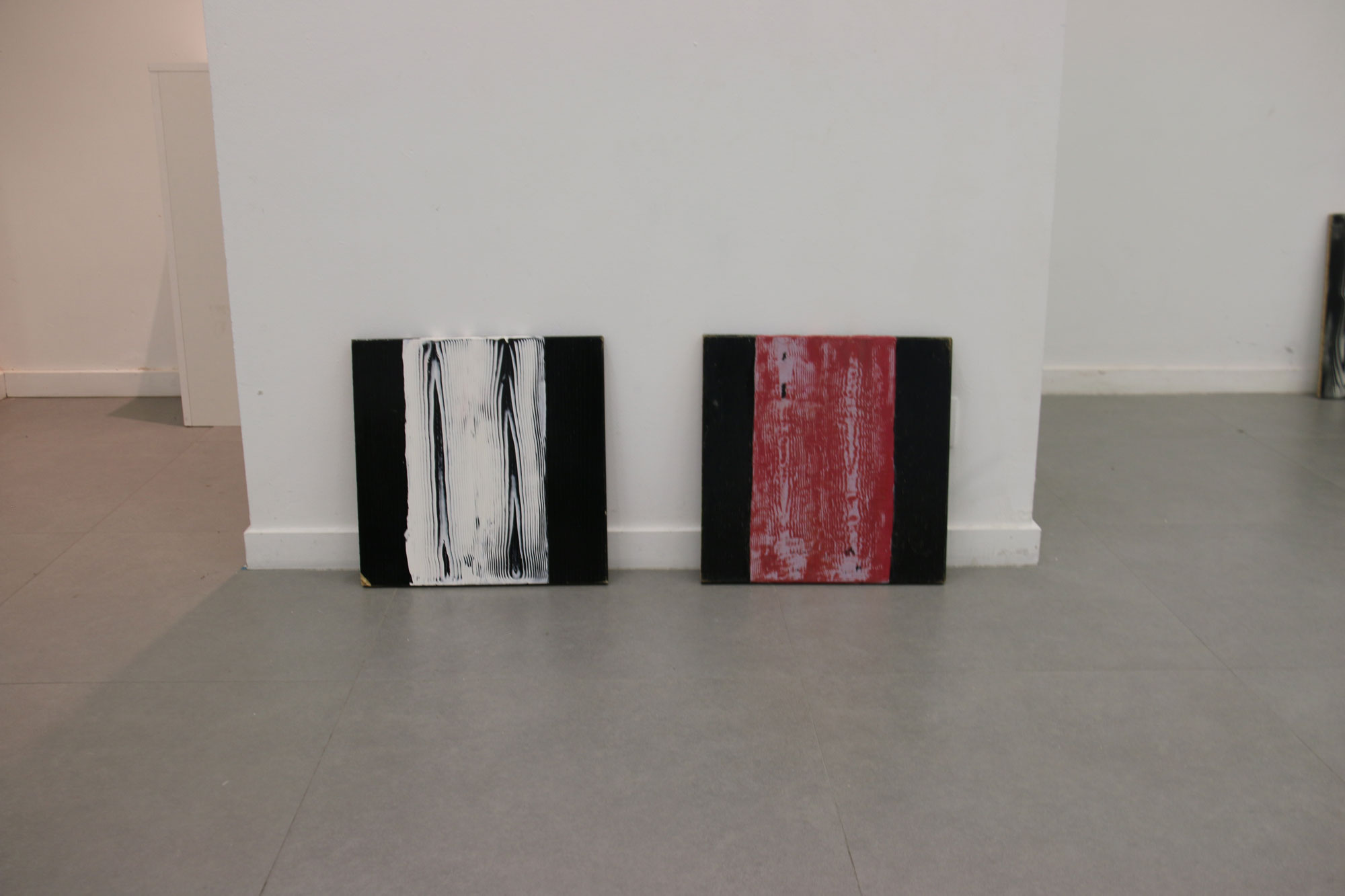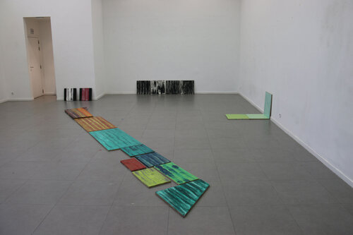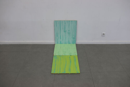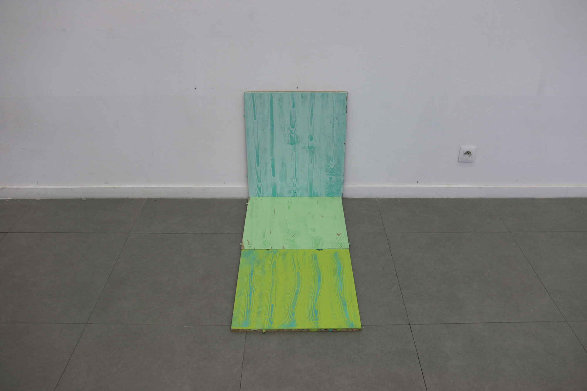 Chaque motif bois est recherché artificiellement, les planche traitées sont du bois transformé, les veines du bois n’étant plus, je cherche à les retrouver par la peinture. Protocole mis en place suite à des observations de nature, dans l’espace urbain. Nature toujours contrôlée.